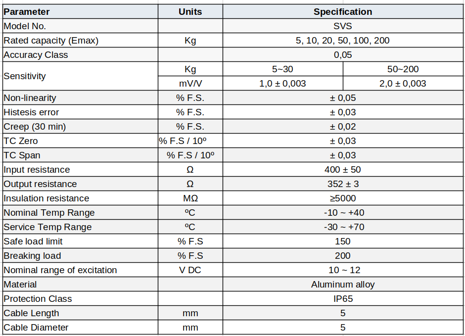 SVS Load Cell Specifications: