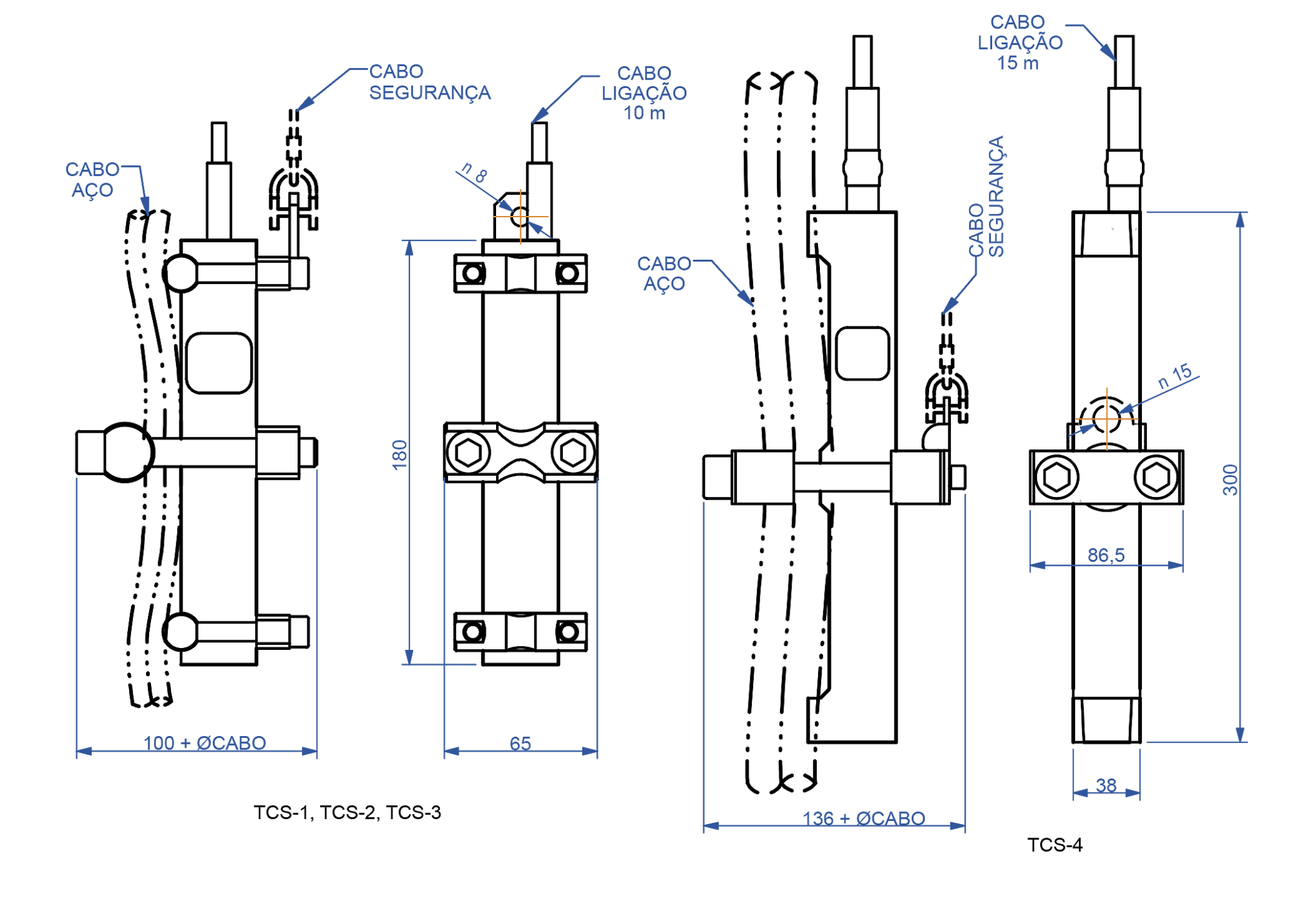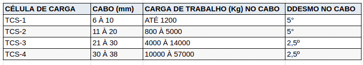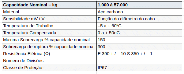É utilizada para medir o esforço de tração em cabos de aço e fornecer sinal do peso ao indicador de pesagem com relés de nível, programados para atuar nos valores limites de segurança ao equipamento, impedindo o levantamento de cargas excessivas. Instala-se a Célula Limitadora de Carga TC parafusada diretamente sobre a parte imóvel do cabo de aço (geralmente próximo à polia balanceadora), sem a necessidade de interrupção do cabo ou acesso às pontas. O princípio de funcionamento consiste em provocar ligeiro desvio (de 2,5 a 5º) em forma de”V” raso no cabo de aço e medir a força restauradora resultante nos encostos do desviador, aplicados diretamente sobre célula de carga. Pelo fato de não ser necessário interromper o cabo de aço e não provocar deflexões acentuadas, a confiabilidade do cabo é preservada. Como a força resultante é afetada pelas características construtivas do cabo de aço e do sistema de polias da ponte ou guindaste, recomenda-se efetuar calibração final após instalação, erguendo-se pesos conhecidos.
